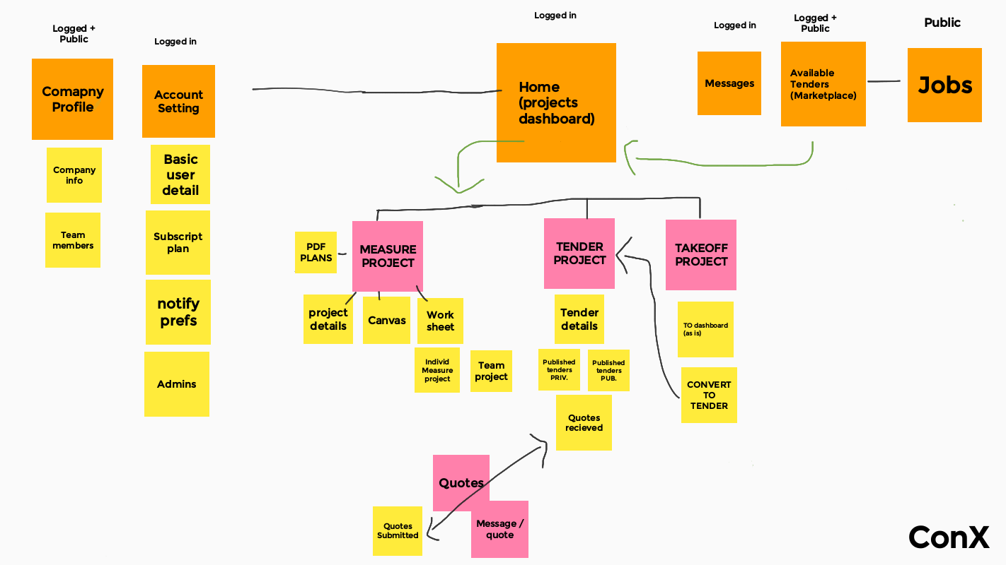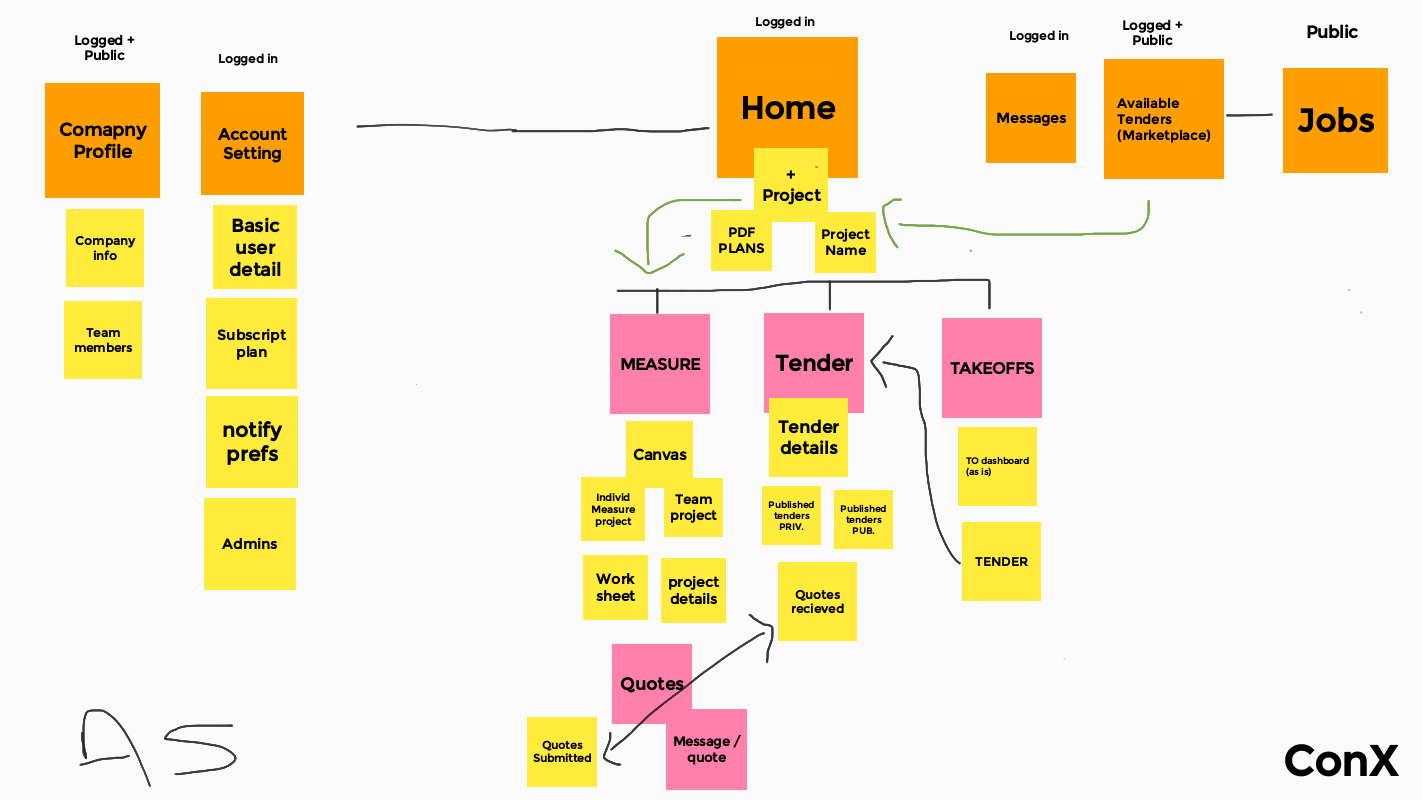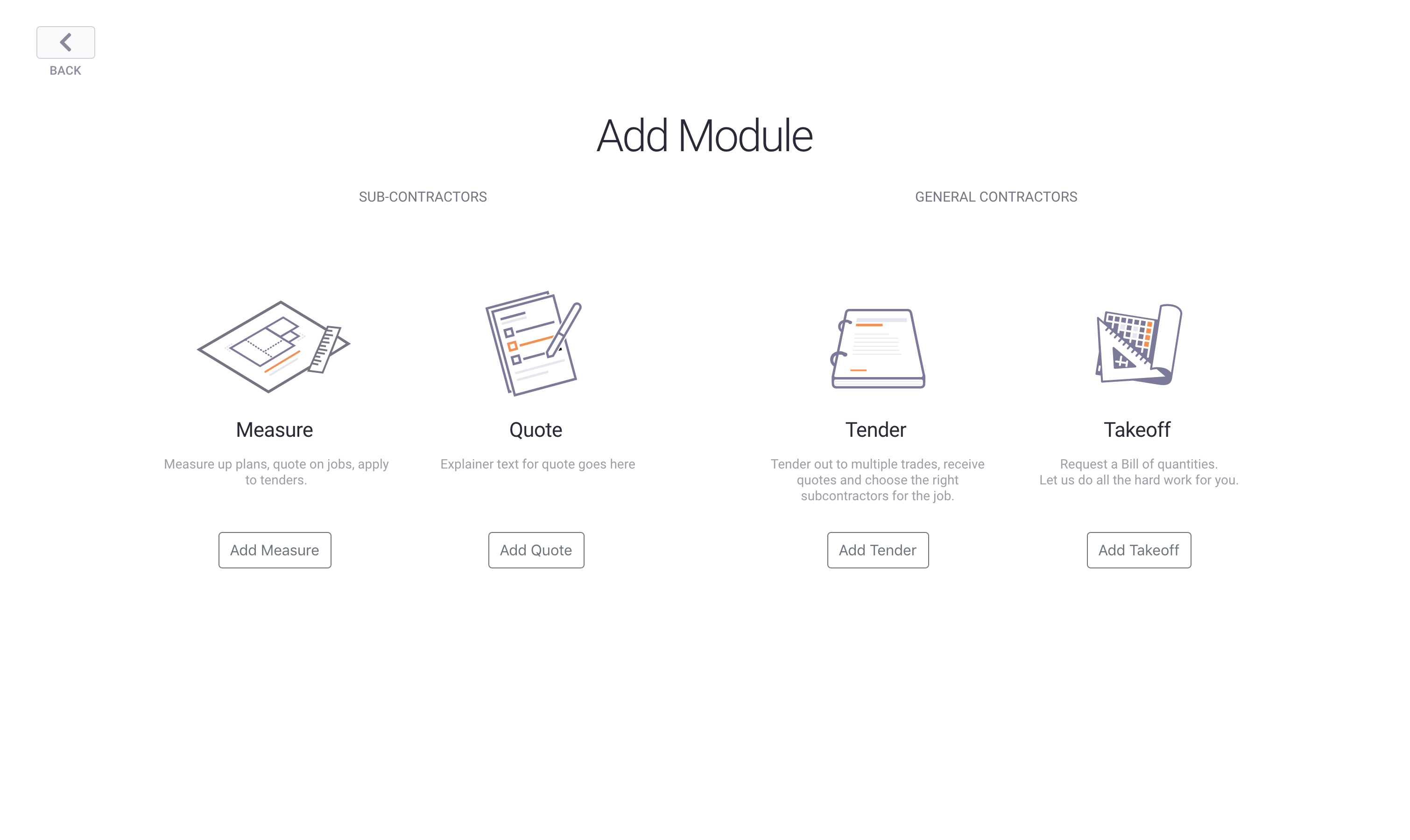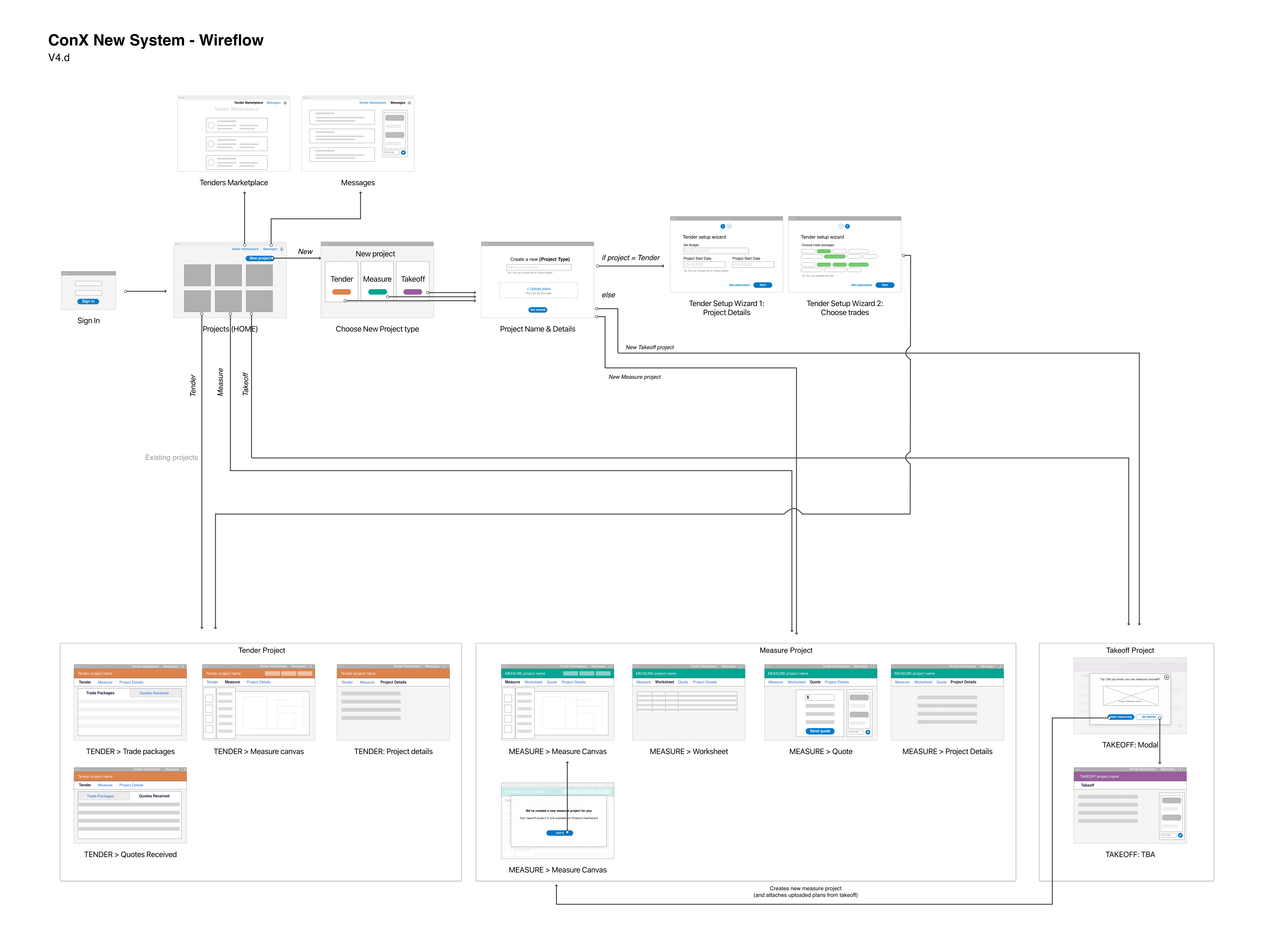 After more discovery it became apparent that the main funnel entry into the ecosystem was Measure, which needs to co-exist in all project types. There was also some confusion with people wanting to simply Measure plans, and then deciding to create a quote or a tender.
