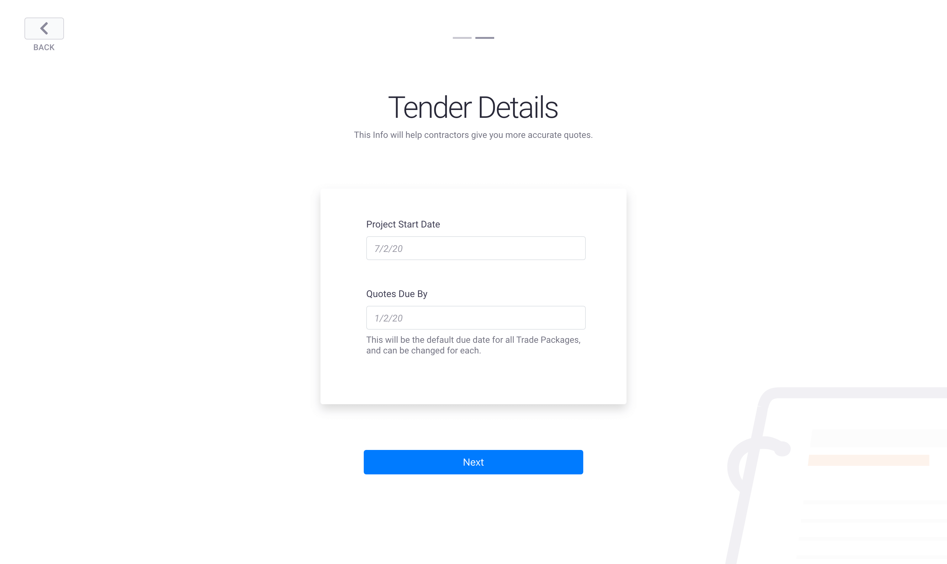 • Streamline Tenders creation process for builders = better experience for contractors searching. A double sided marketplace means a double sided problem. Make it easy for builders to post and better experience for people quoting.
