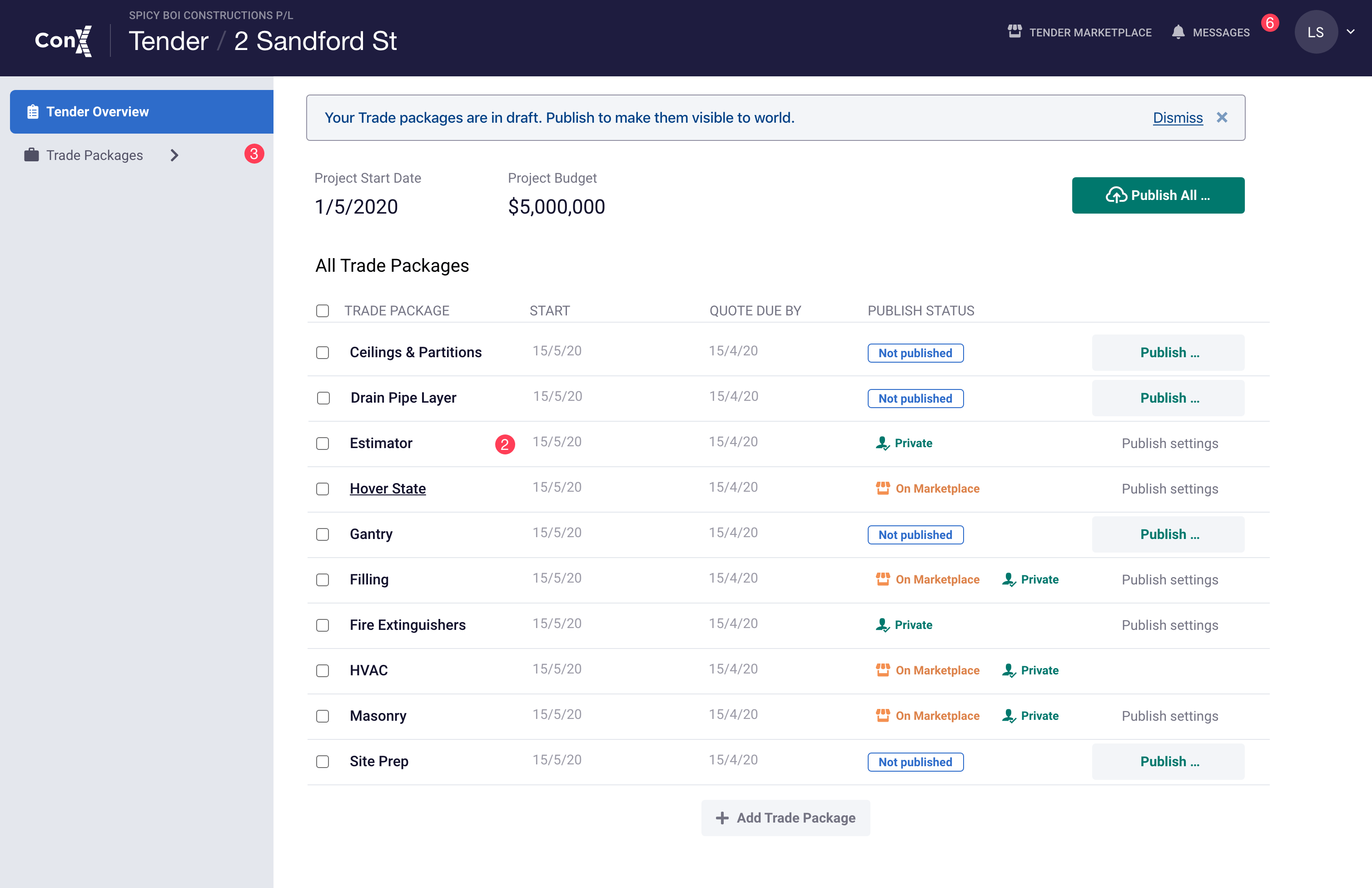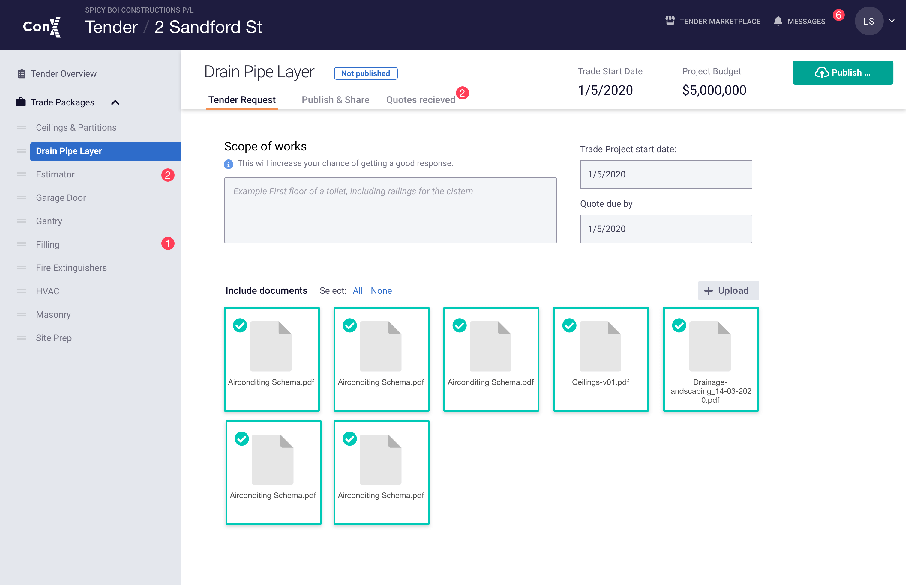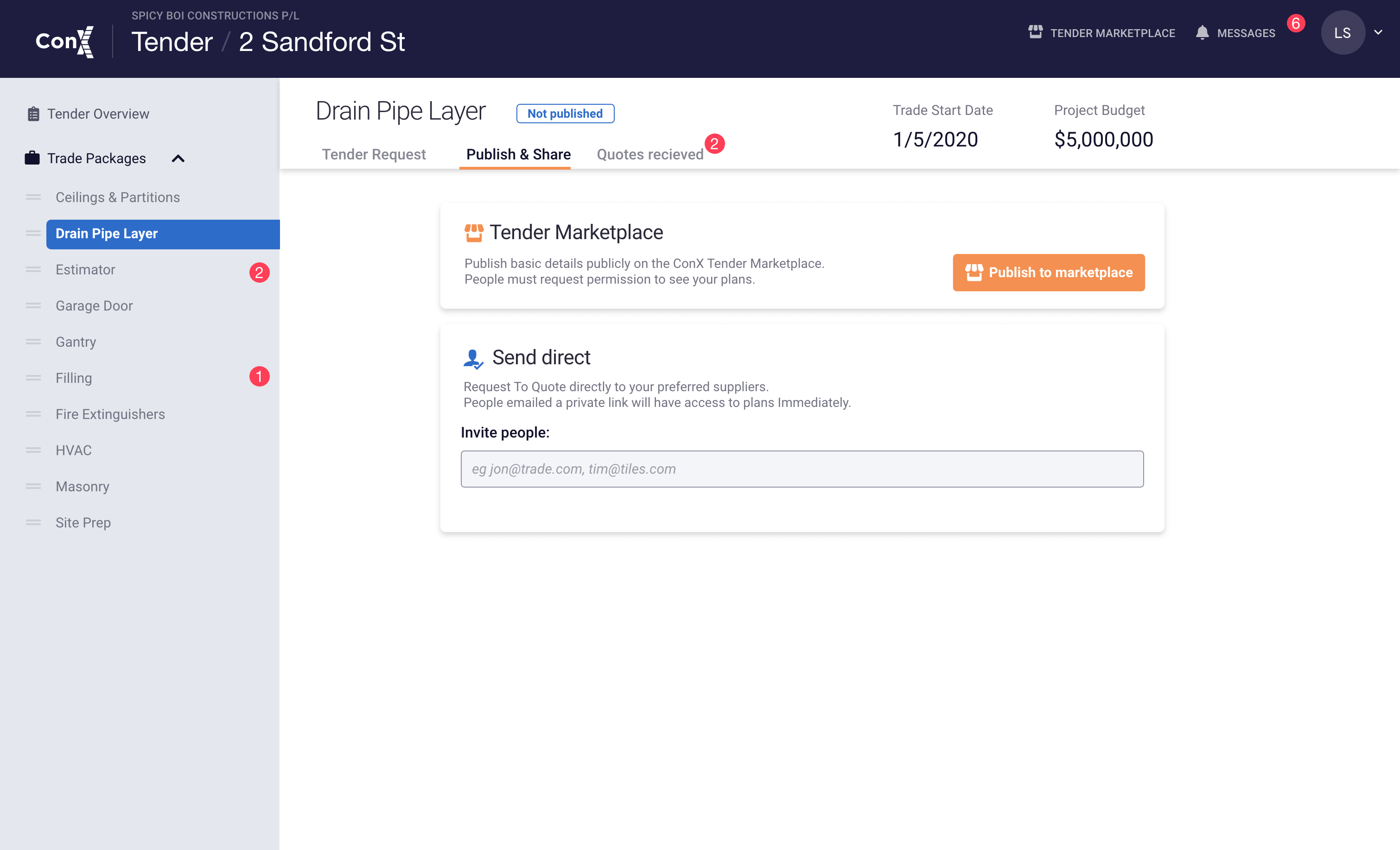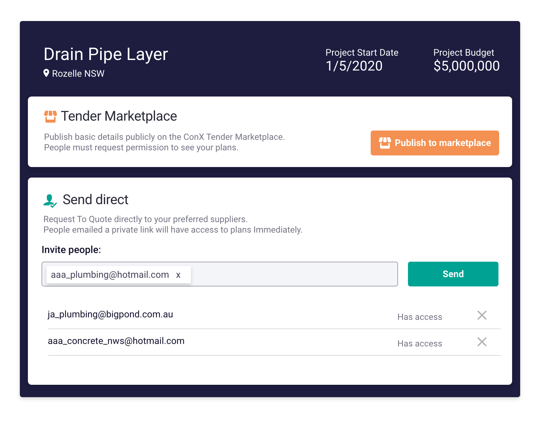 • Create a public 'Tender Marketplace'; a public site for builders to publish to, and contractors to quote on (currently users have to be logged in to see available tenders).