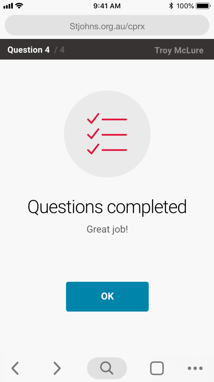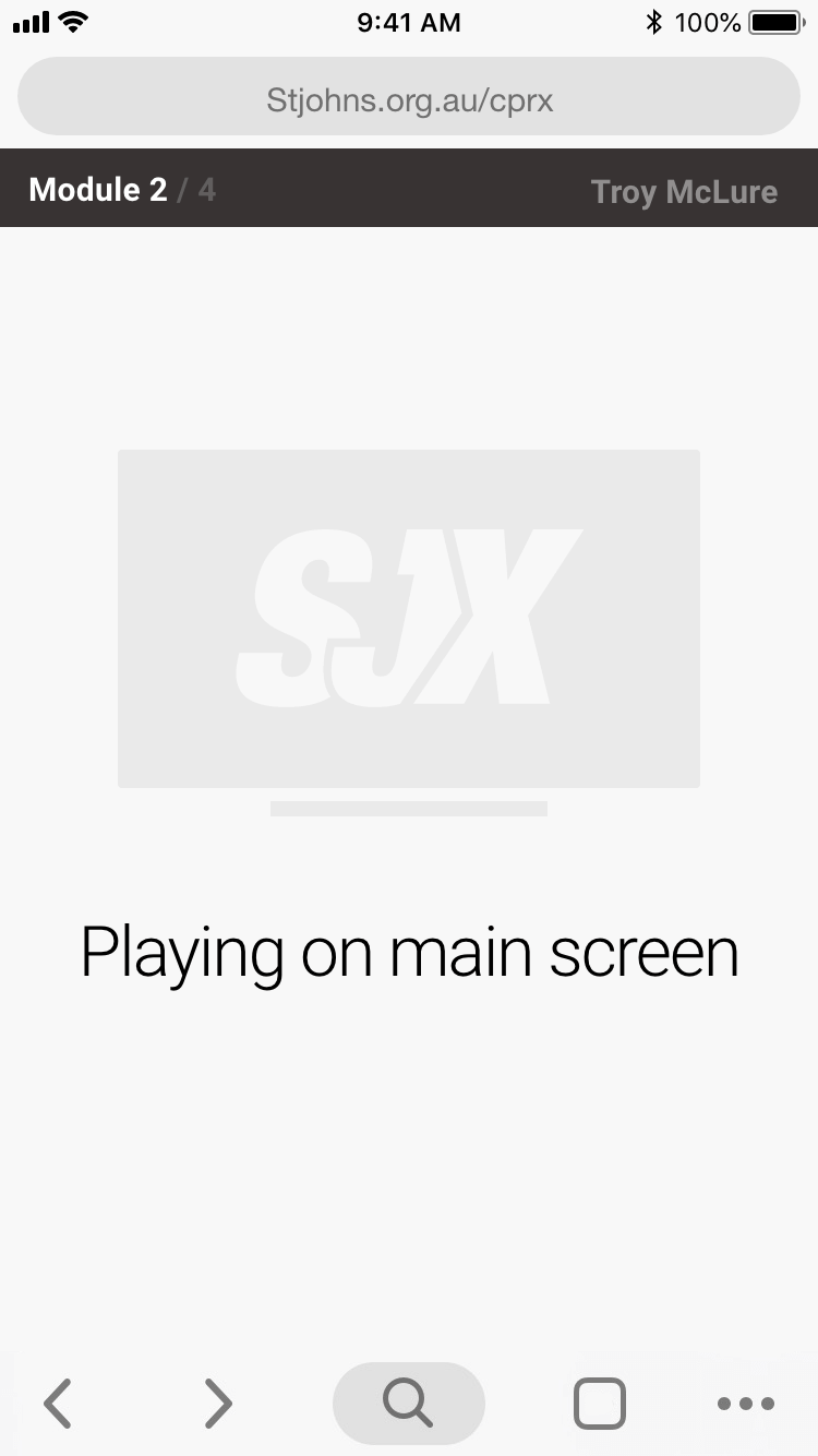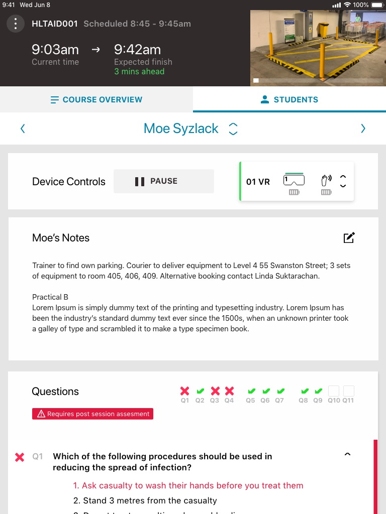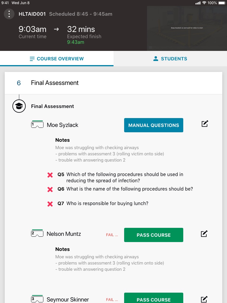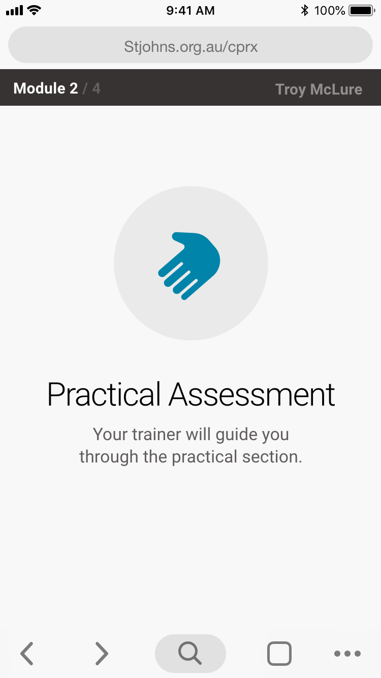 Here is each stage of the process, from login, watch video, answer questions on device, pause for practical assessment.