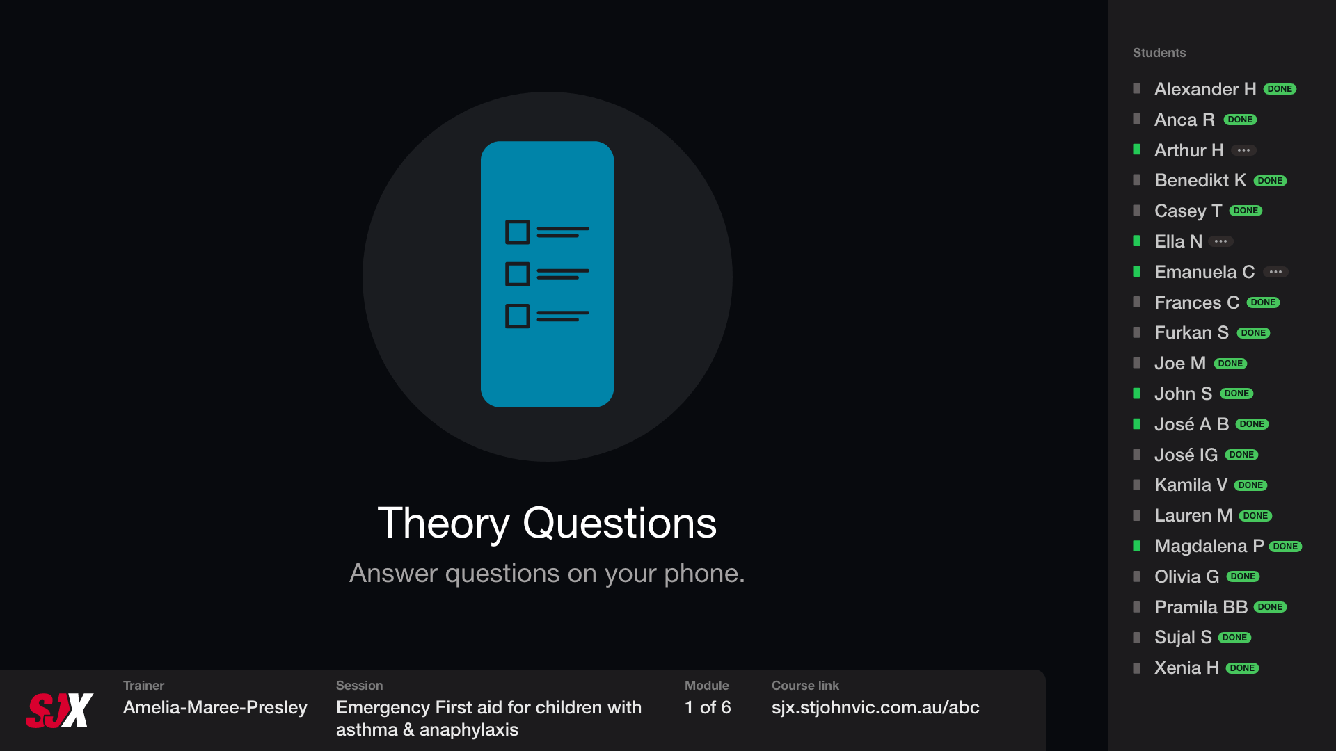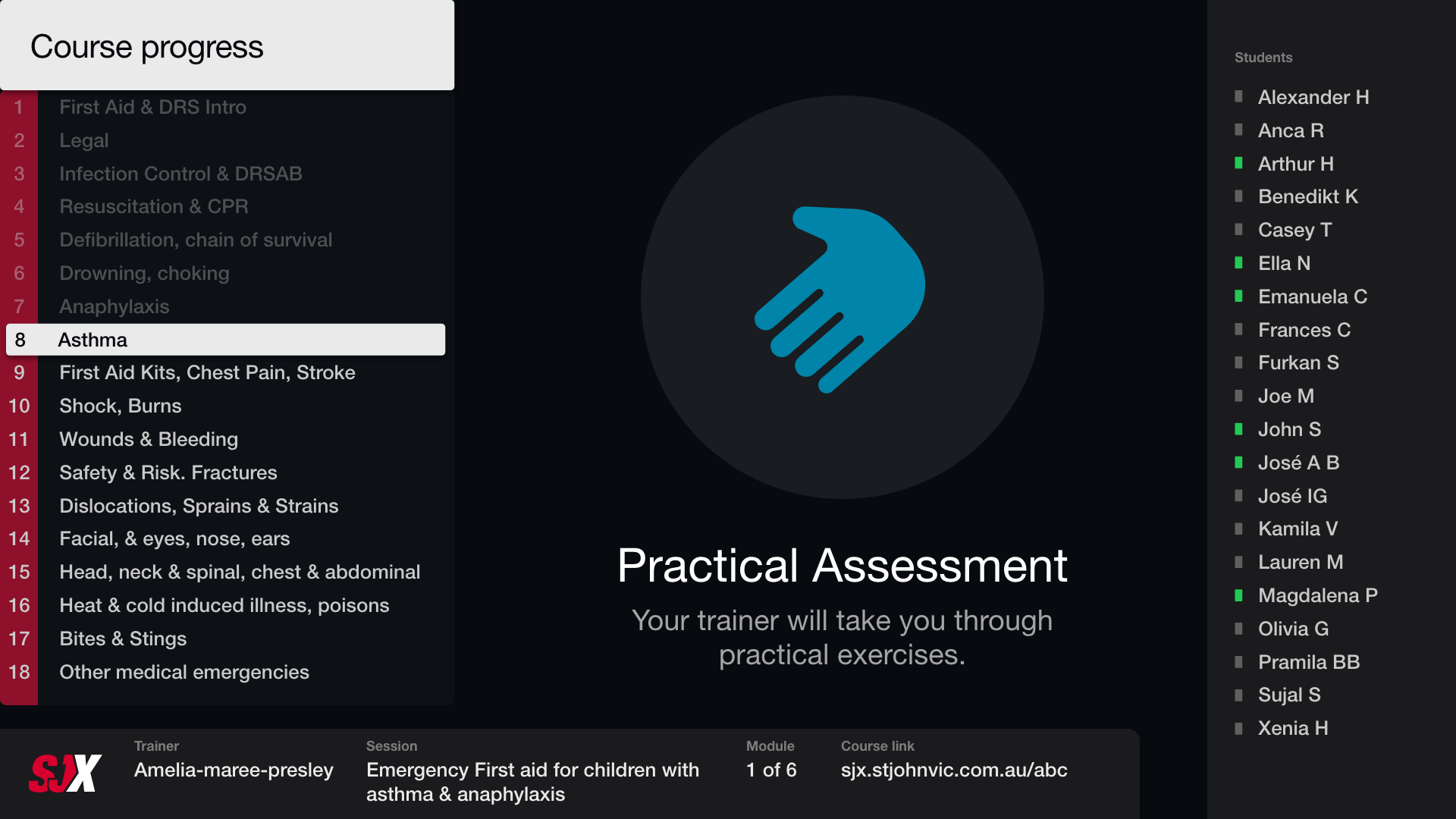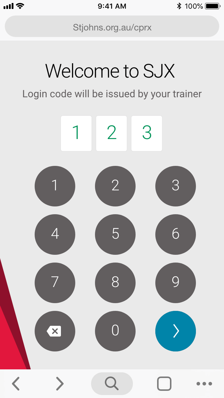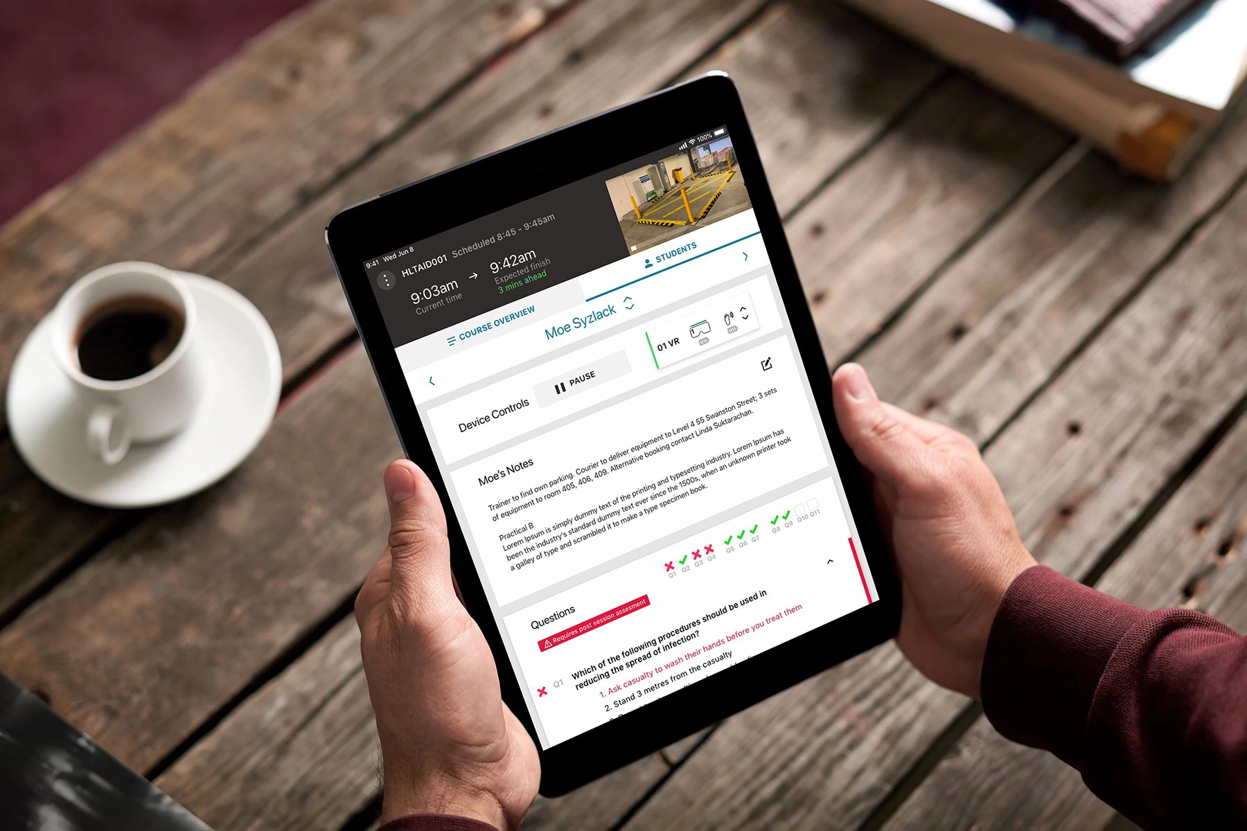 Here is each stage of the process, from login, watch video, answer questions on device, pause for practical assessment.